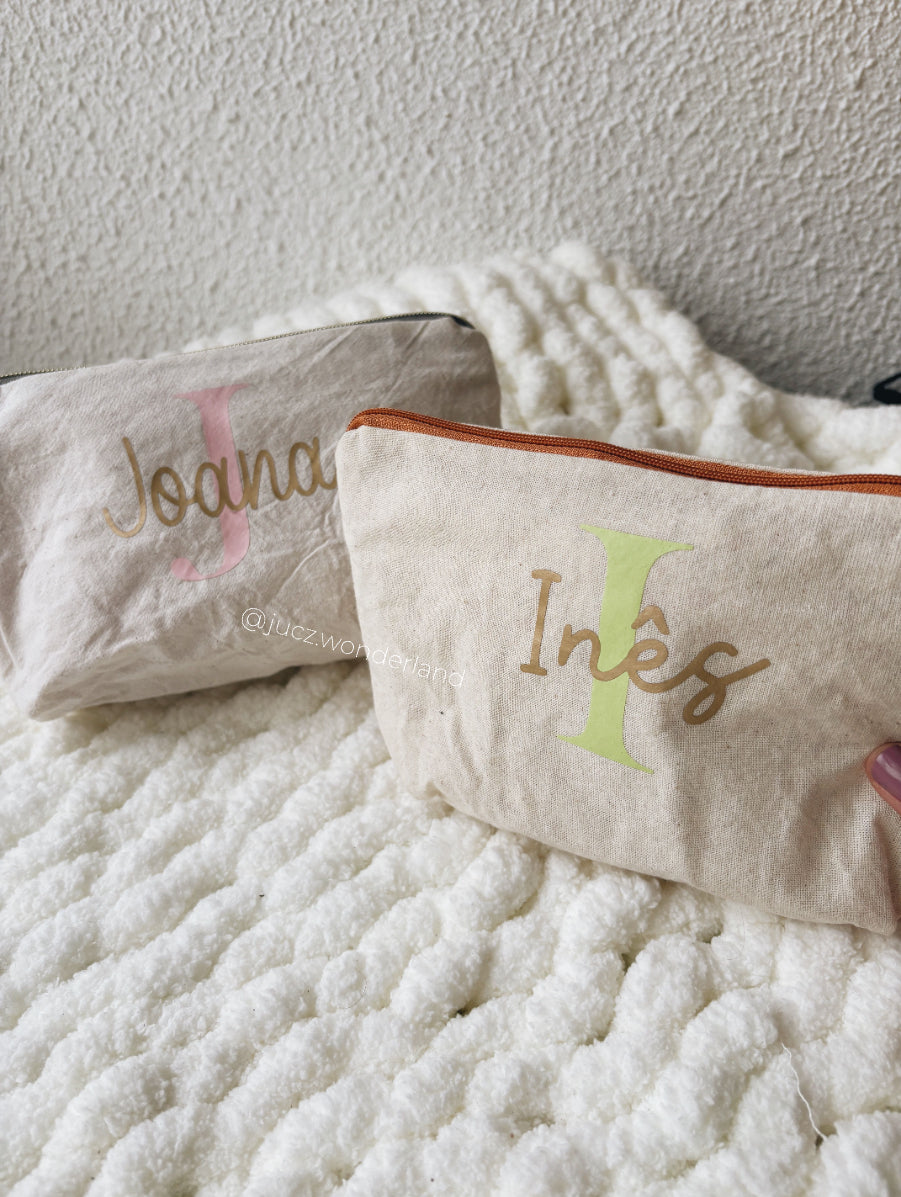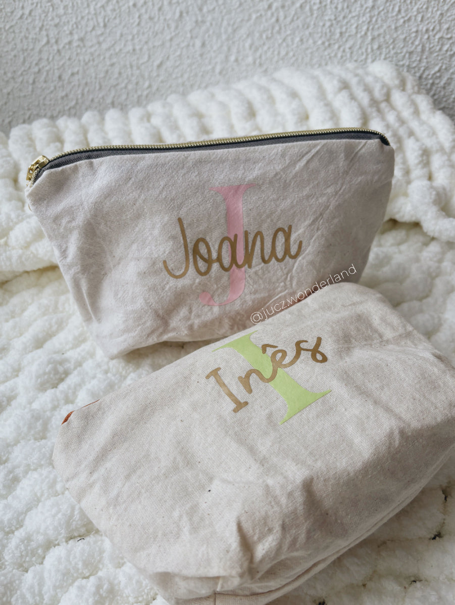 In the Order Notes at checkout, include the text you’d like on your pouch and which color you prefere.